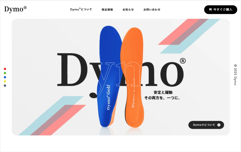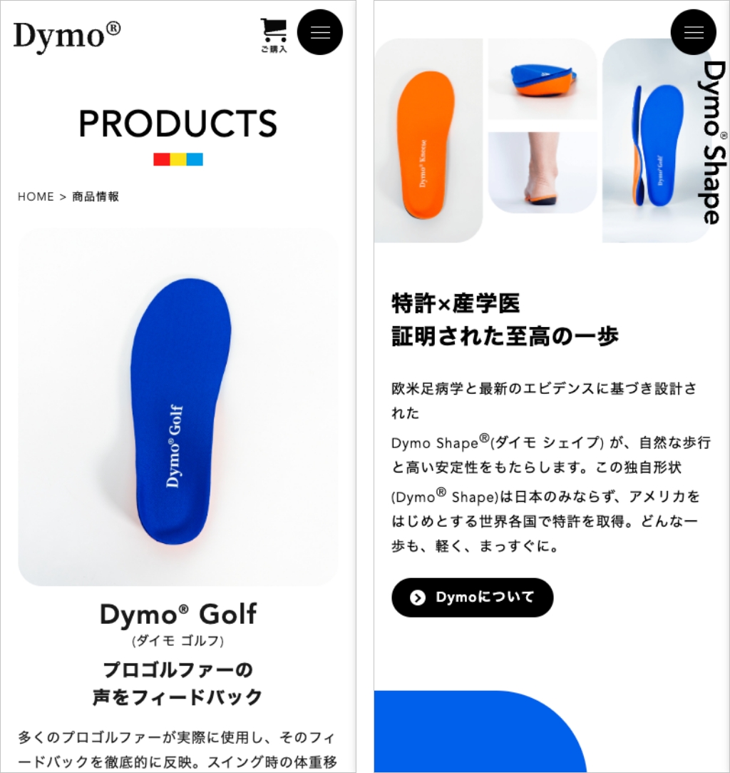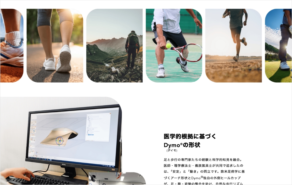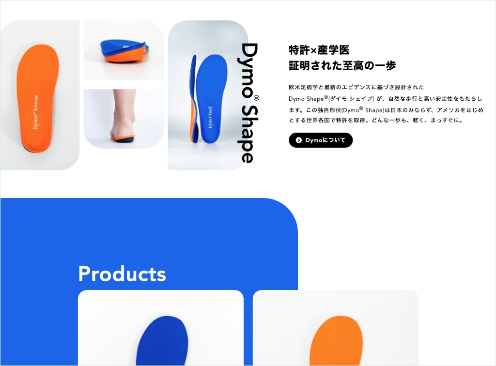 医学的観点の研究から生まれたインソール、Dymoのブランドサイトの制作を行わさせていただきました。ブランドサイトと合わせて、パッケージも2製品デザインさせていただきました。